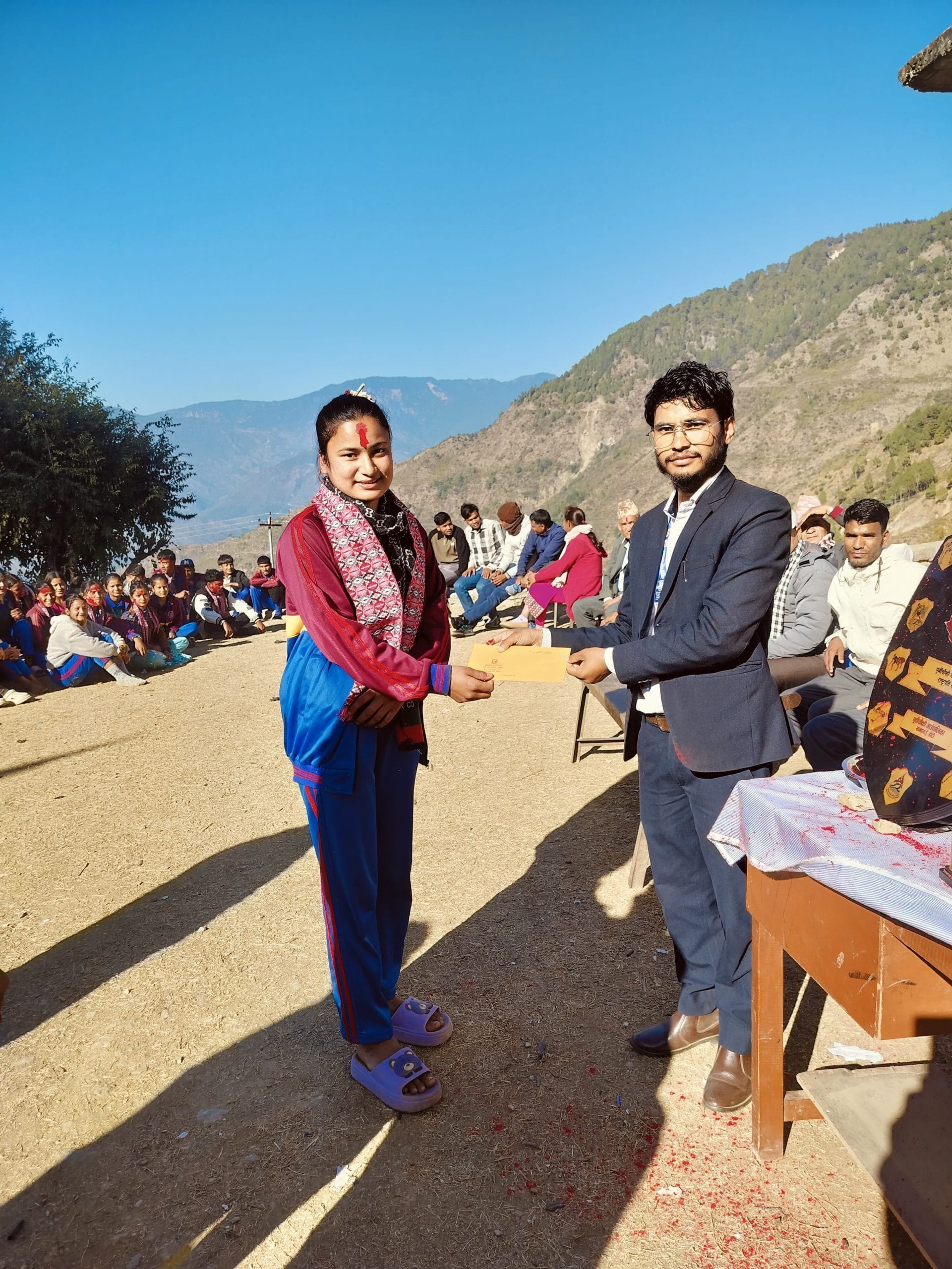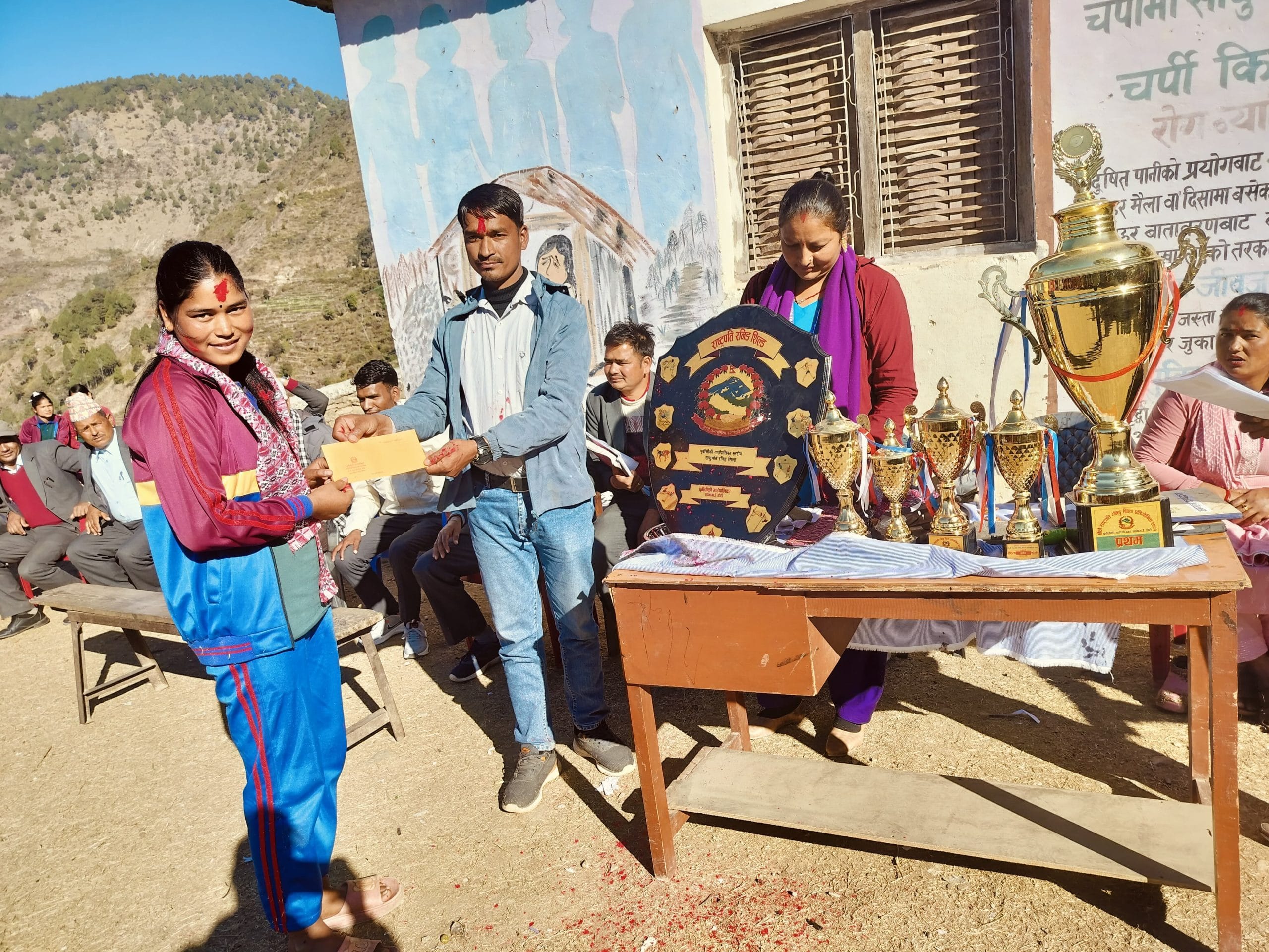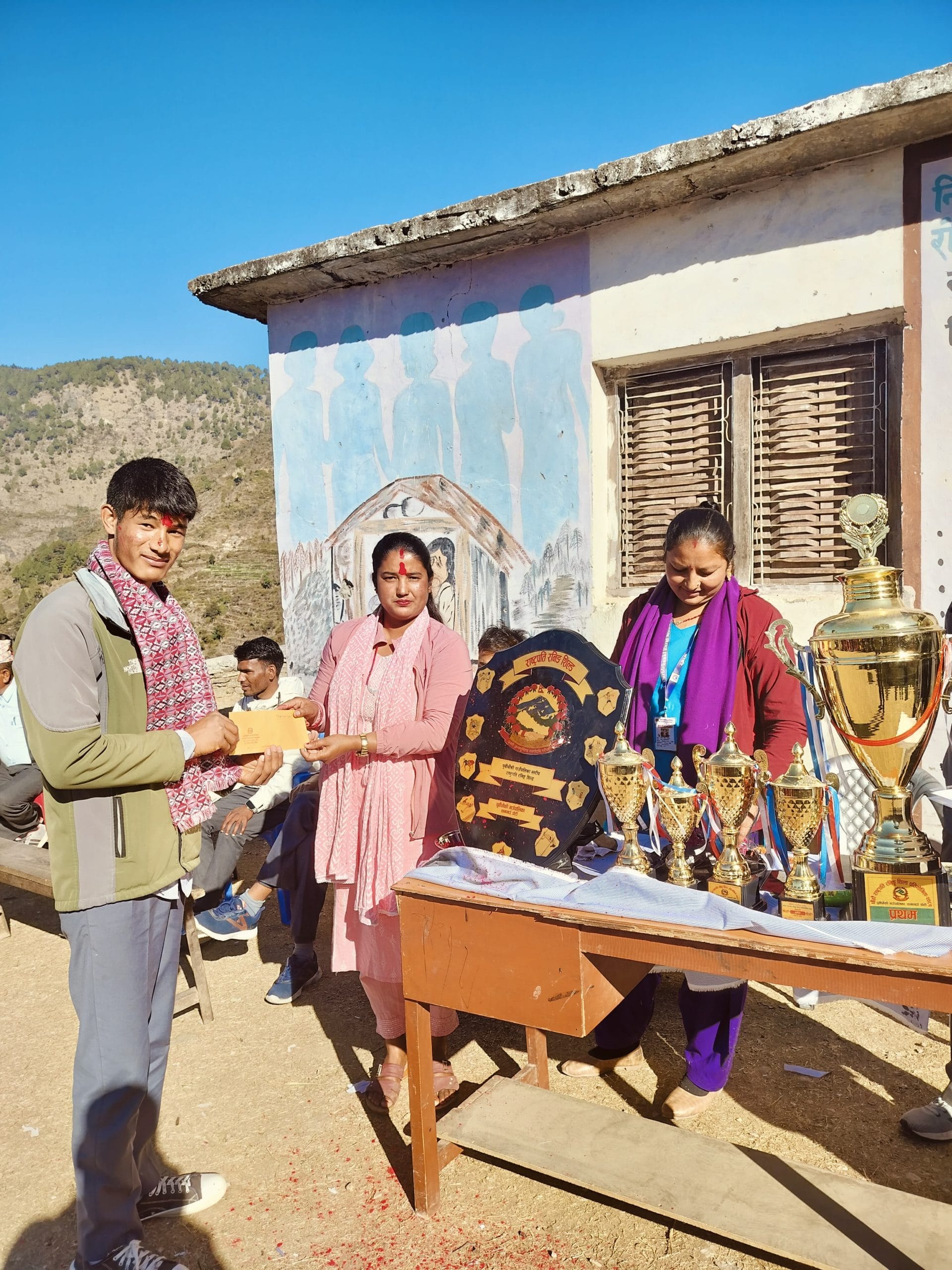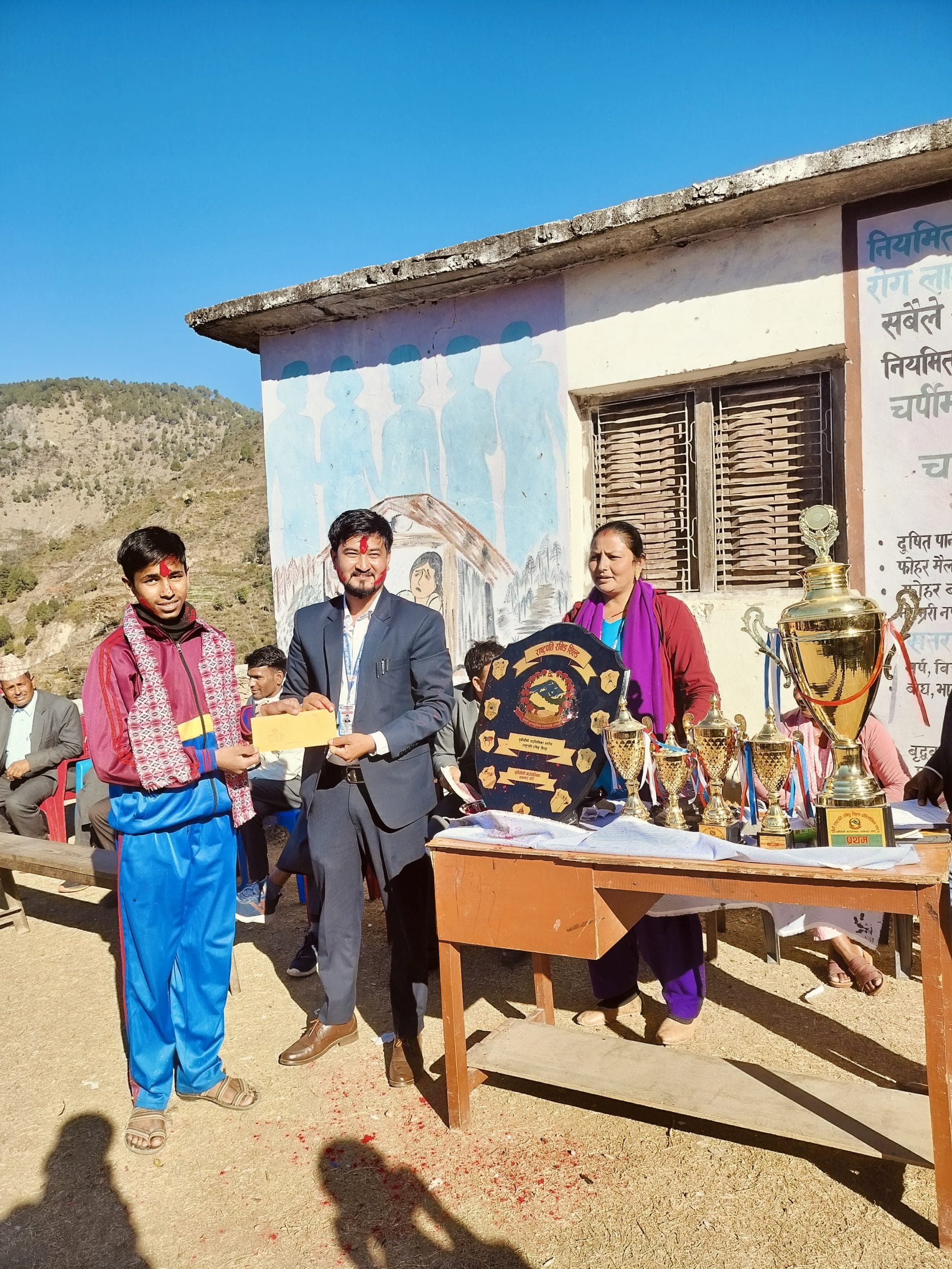 याे विद्यालय भाैगाेलिक दृष्टिले दुरिमा भए पनि सिमित स्रोत र साधनका बाबजुद पनि विद्यार्थीहरुले उत्कृष्ट खेल प्रदर्शनी गरेर राष्ट्रपति रनिङ शिल्डकाे उपाधि दिलाएकोमा धन्यवाद दिदै सम्मान गरिएको वडा अध्यक्ष प्रेम खड्काले बताए ।