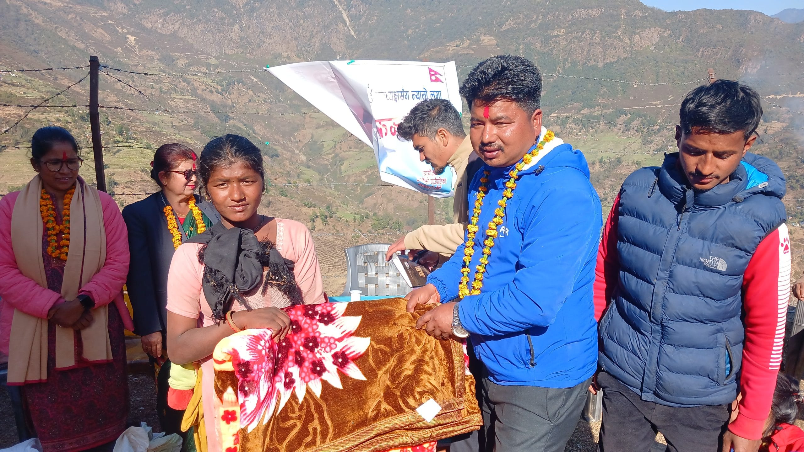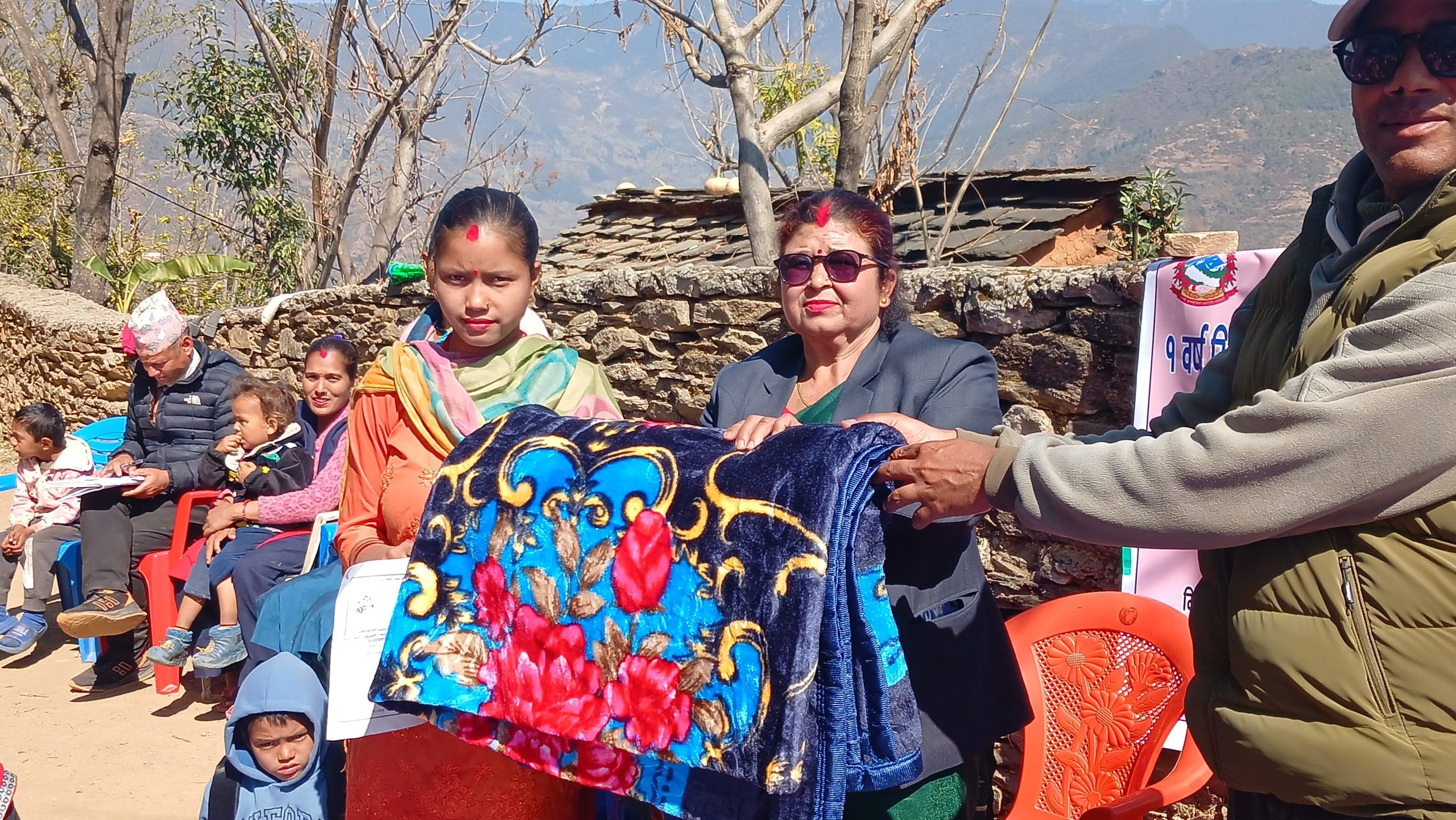 गाउपालिकाका उपाध्यक्ष पशुपति खड्काले शुक्रबार पालिकाकाे वडा नं.१ खिरसैन, वडा नं.२ बगलेक,र शनिवार वडा नं.४ सानागाउँ ,वडा नं.५ काडामाण्डाैका महिलाहरूलाई न्यानो कपडा कम्मल वितरण गर्नु भएकाे छ ।