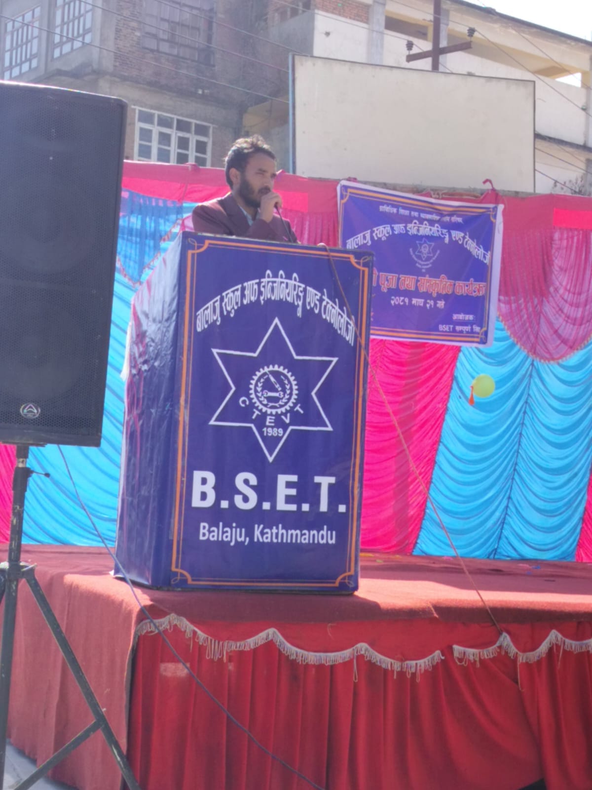 काठमाण्डौ -बालाजु स्कुल अफ ईन्जिनियरिङ एण्ड टेक्नोलोजी कलेजमा अध्ययरत विशेष छात्रवृत्ति कार्यक्रम अन्तर्गत डिप्लोमा ईन बायोमेडिकल ईन्जिनियर कार्यक्रममा द्रोस्रो वर्ष ,द्रोस्रो खण्डमा अध्ययनरत तथा सम्पुर्ण डिप्लोमा तथा प्रि-डिप्लोमा कार्यक्रम अध्ययनरत विध्यार्थीहरुको आयोजनामा सरस्वती पुजा अर्थात्, श्री पञ्चमीको अवसरमा विविध प्रतिभा प्रस्फुटन कार्यक्रम सोमबार सम्पन्न भएको छ ।